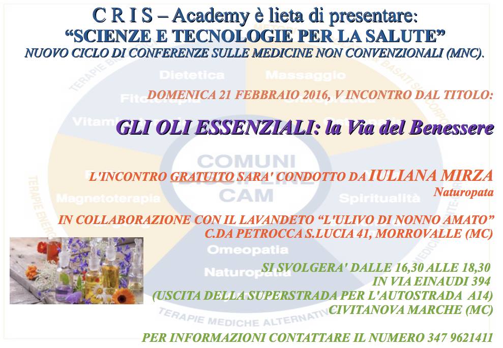 Da febbraio riprendono i miei incontri, il primo con il titolo “Gli oli essenziali. La via del benessere” sarà il 21 febbraio, dalle 16,30 a Civitanova Marche presso Cris Academy in via Einaudi 394.