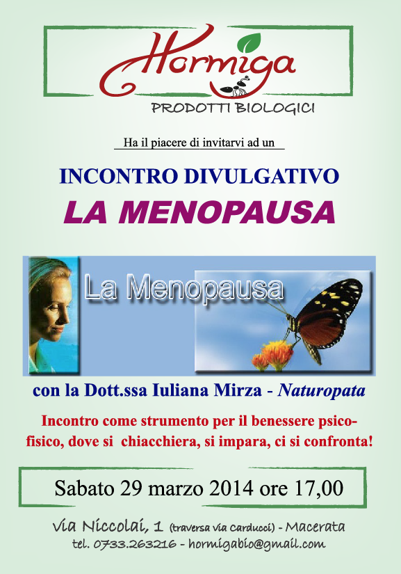 Nel 2013 e 2014 in collaborazione con l’Assessorato alle Pari Opportunità del Comune di Porto Sant‘Elpidio nel ciclo di incontri “Menopausa Felice” dedicati alle donne residenti dai 45 ai 50 anni, ho presentato l’approccio Naturopatico alla menopausa. Questo parte dalla considerazione che la menopausa non è una malattia, ma una nuova condizione fisiologica per la donna, che non è più fertile, nella quale si deve trovare un nuovo equilibrio, armonizzando la sfera fisica e quella psichica individuale.