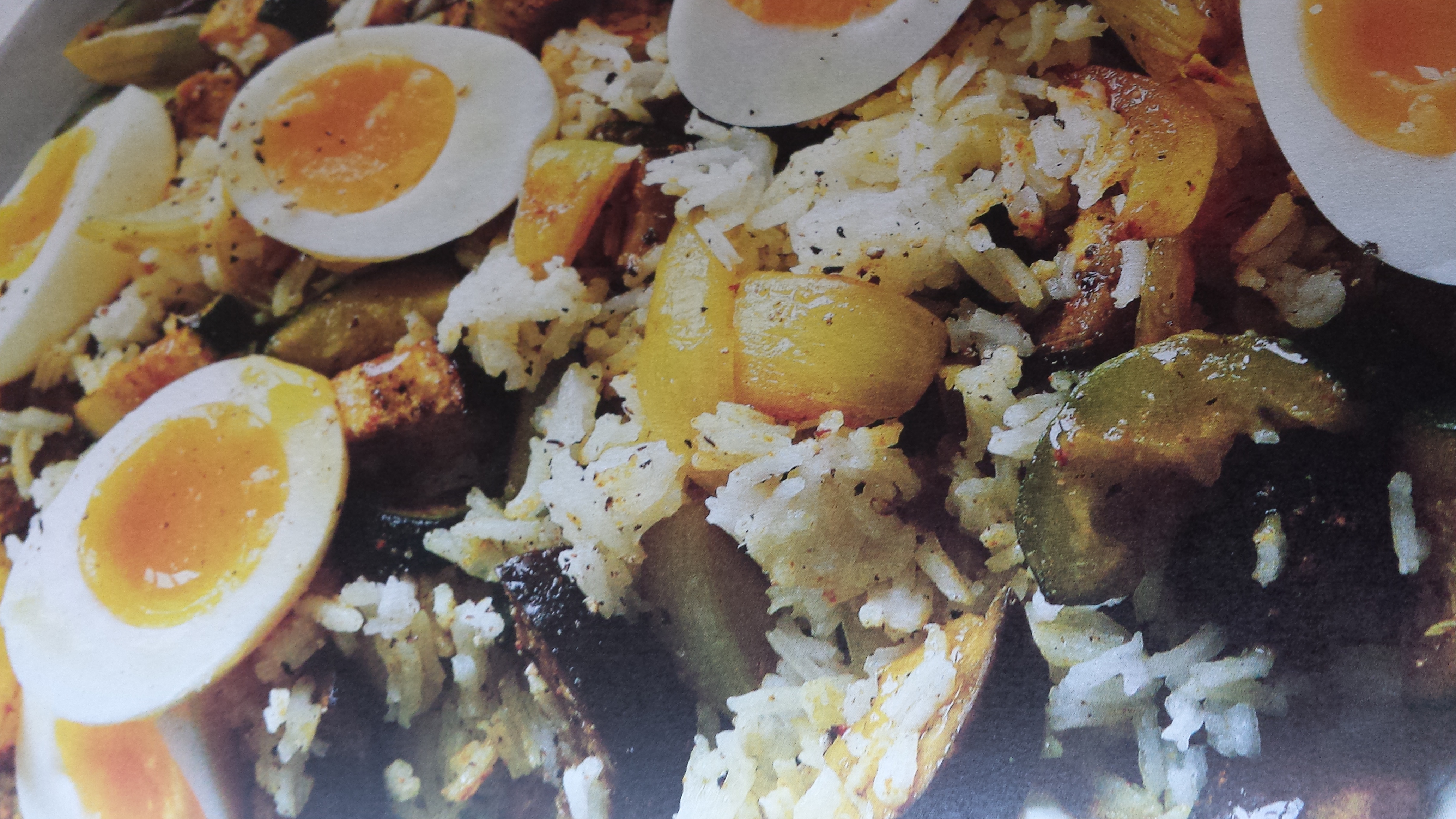Il kedgeree è una deliziosa combinazione di riso, curry e pesce affumicato. Ho voluto provare a creare un piatto altrettanto goloso senza pesce, sostituendolo con le melanzane: dolci e dall’aroma affumicato, sono perfette con il riso speziato. Le zucchine e le cipolle, accompagnate dalle uova sode morbide, arrotondano il gusto di questa preparazione. Potete realizzarla anche solo con melanzane e cipolle, ma io la preferisco anche con le zucchine.